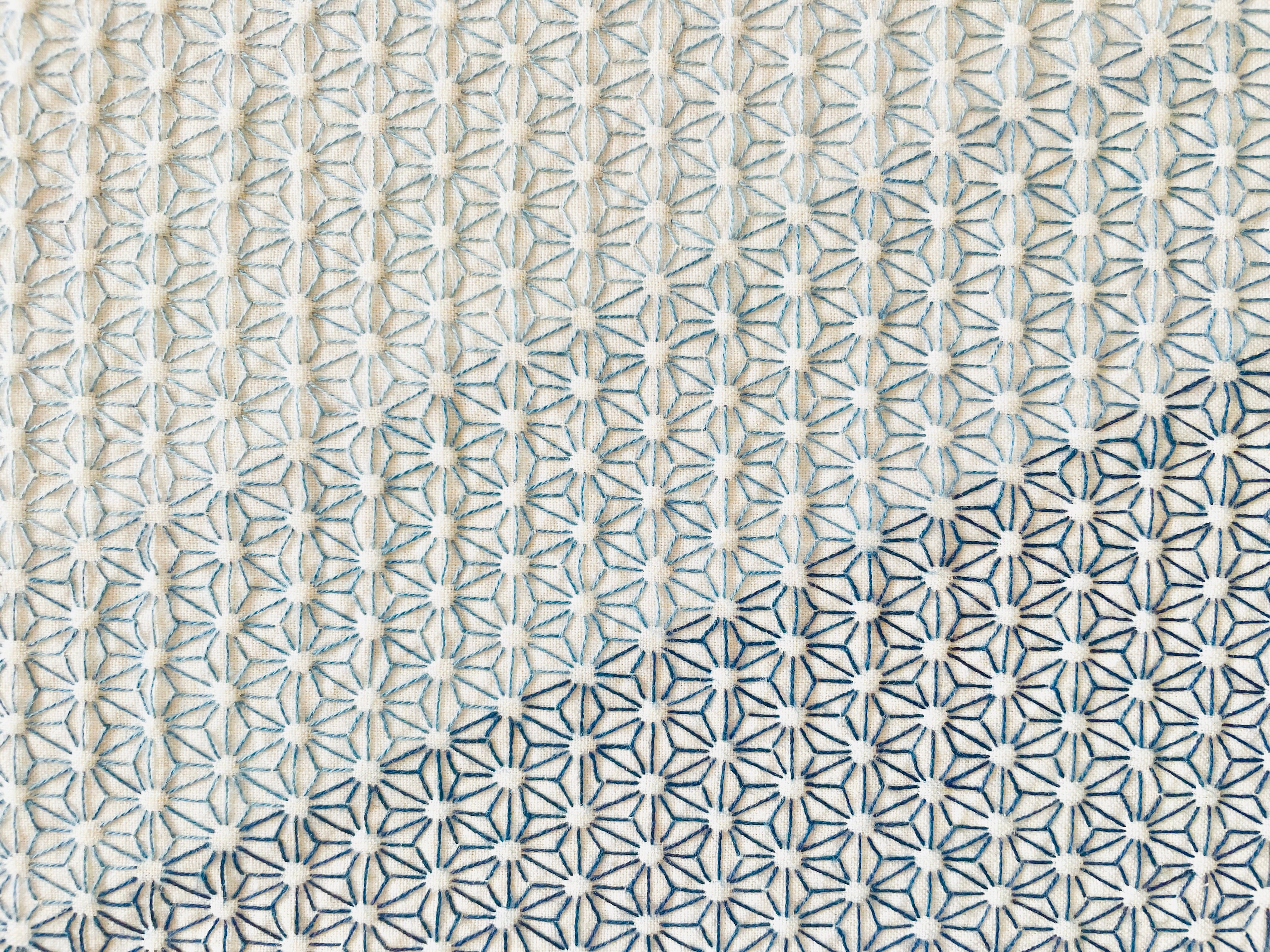 ちゃんと生きているのに。 どこか、ノイズがある。 理由はわからなくても、 この額装があると、少し抜ける。 リビングで過ごす時間。 何気ない会話や、途切れた沈黙の中で。 ふと視界に入るたびに、わずかに整っていく。 刺し子をしているとき、私はよく、その状態になる。 整えようとしているわけではなくて。 ただ針を動かしているだけなのに。 気づいたら、静かに揃っている。 針目のリズム、余白の間隔。 そろっていることそのものが、空間にひろがっていく。 この布には、いくつかの意味が重なっています。 魔除けとして伝わってきた「麻の葉」。 豊かさと繁栄を意味する「亀甲花刺し」。 五穀豊穣を願う「米刺し」。 願いとして受け継がれてきたかたちが、 静かに、そこに在ります。 何かを変えるためではなくて。 ただ、そこに在ることで、整っていく。 When you see it, something returns to center. ⭐︎素材⭐︎ サイズ:約36センチ×36センチ 綿100パーセントの晒し生地、綿糸 ⭐️お取り扱いについて⭐️ ふきんとしてお使いの場合、お洗濯の際は、手洗いをおすすめいたします。 ※送料無料で5日以内に発送いたします(土日祝を除く)