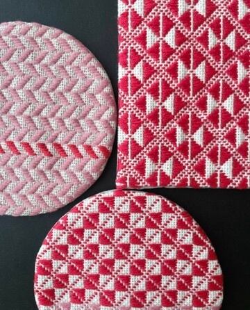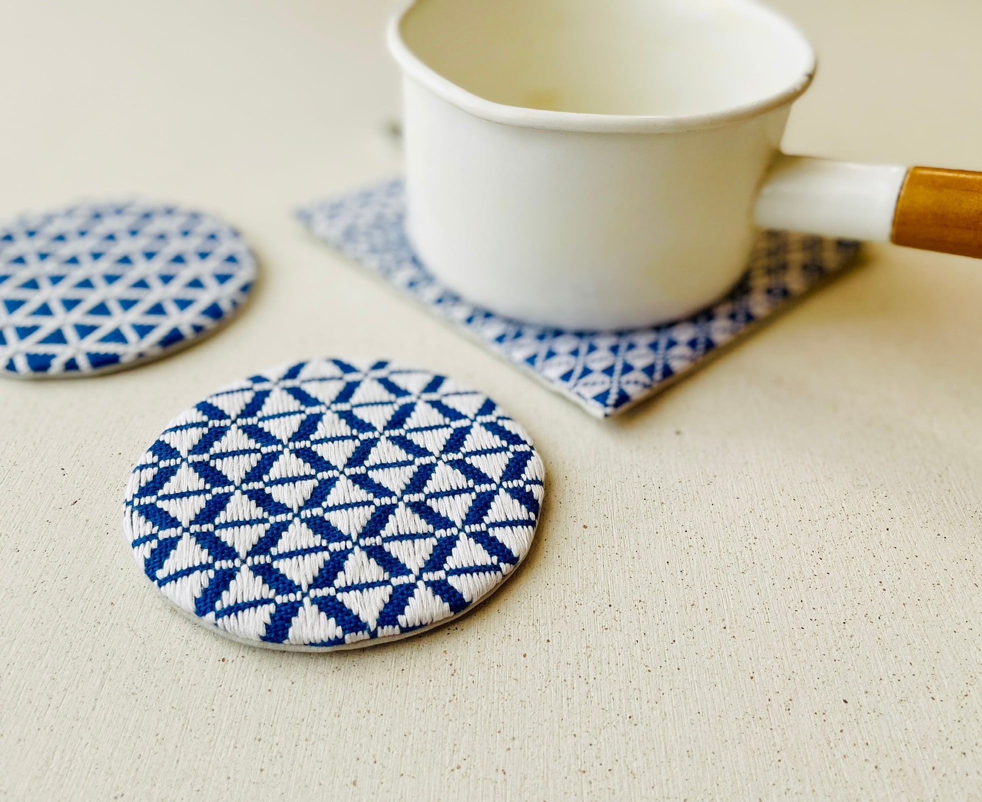 津軽こぎん刺しの幾何学ポットマット|紅と白のあたたかいテーブルアクセント