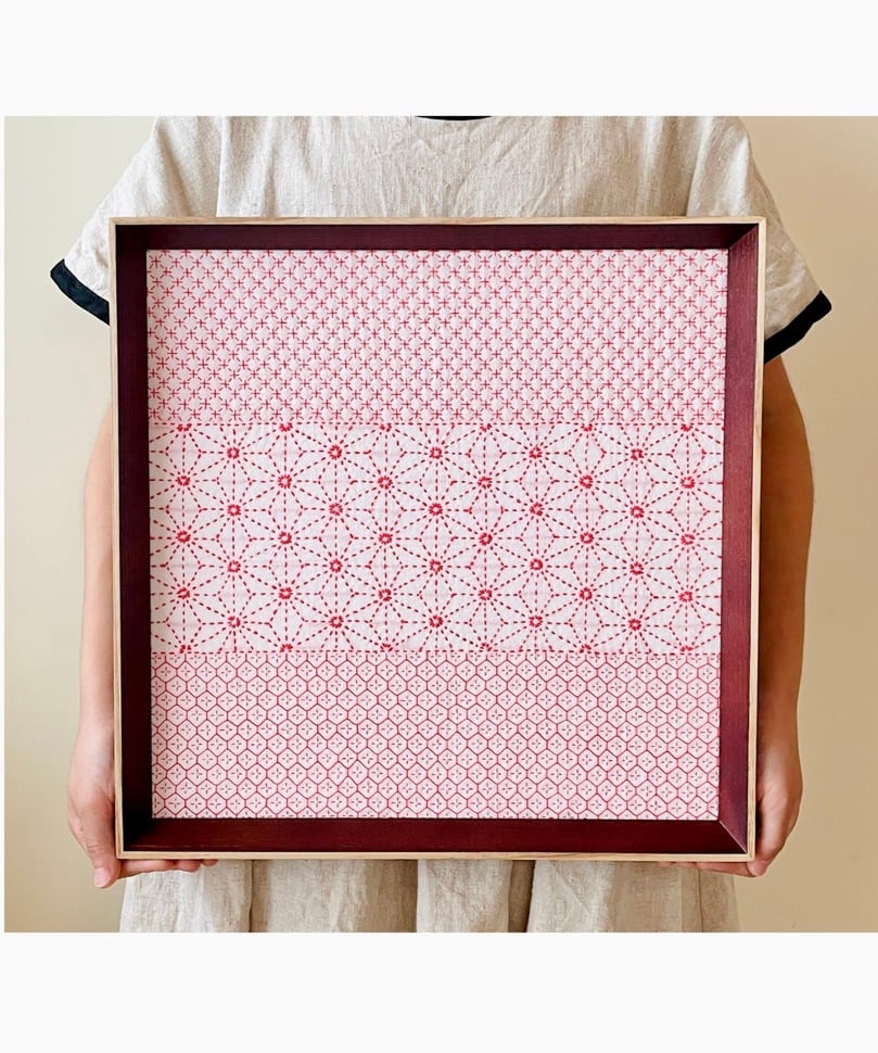 裏にも表にもびっしり糸が渡っています。厚みが増すことで、しっかりとした強度があり、長くご愛用いただけるアイテムとなることを目指しています。インテリアとして役目を終えたあとは、台所の刺し子ふきんとしてご活用できます。かごバッグのカバーや棚の目隠し、小物のほこりよけ、鍋敷きやティーポットのマット、ランチョンマットとしても。